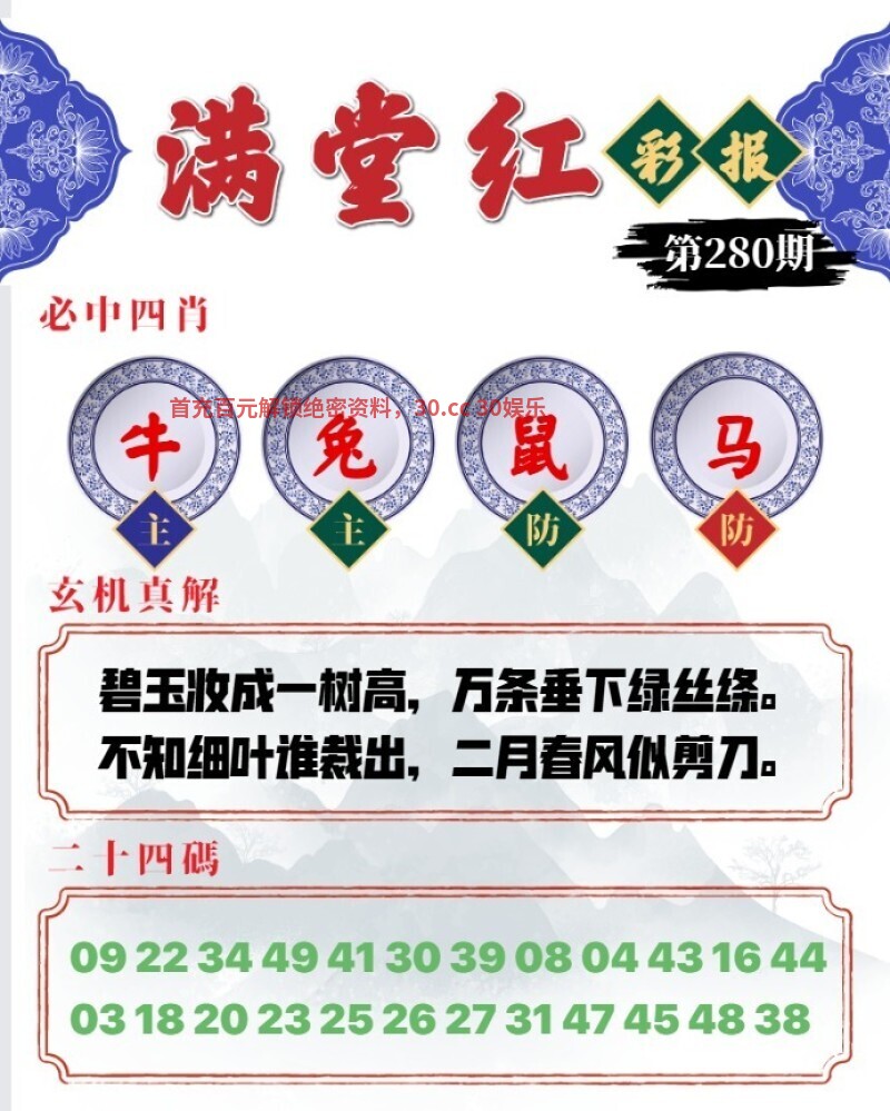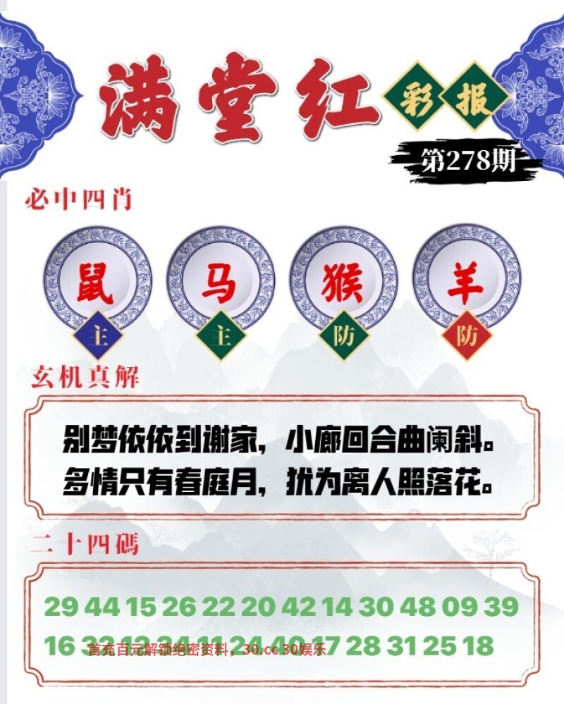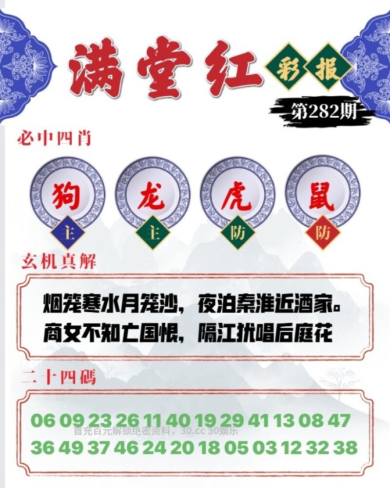 282期满堂红彩报:烟笼寒水月笼沙,夜泊秦淮近酒家。商女不知亡国恨,隔江扰唱后庭花。 六肖:蛇羊猴马龙牛 |